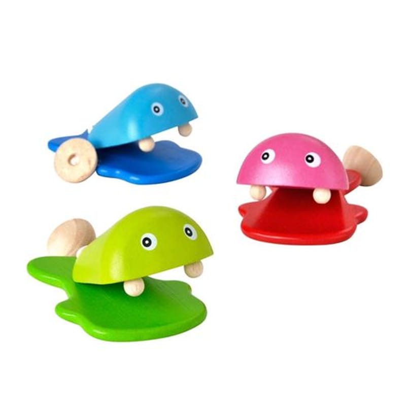 Skaka fiskarna och få dem att klappa! Finns också som ananas och rädisa i kollektionen med kastanjetter från Plan Toys.